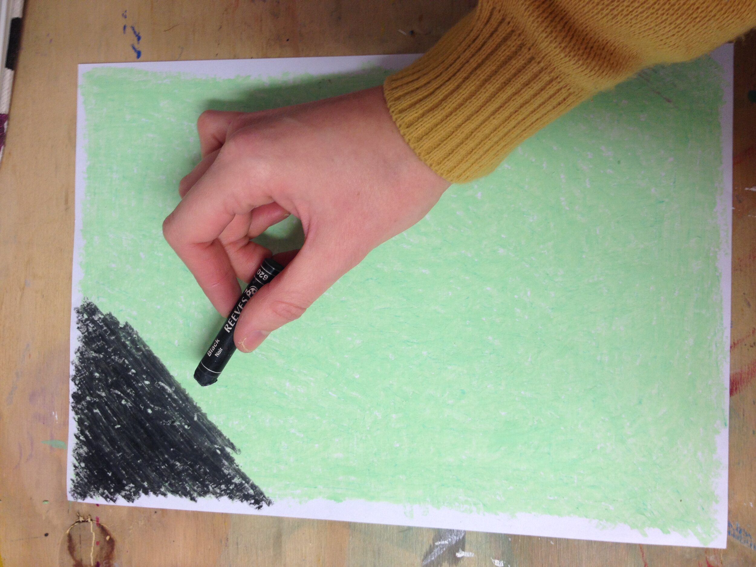 Get a smooth piece of paper. Colour the whole page in a light coloured oil pastel.