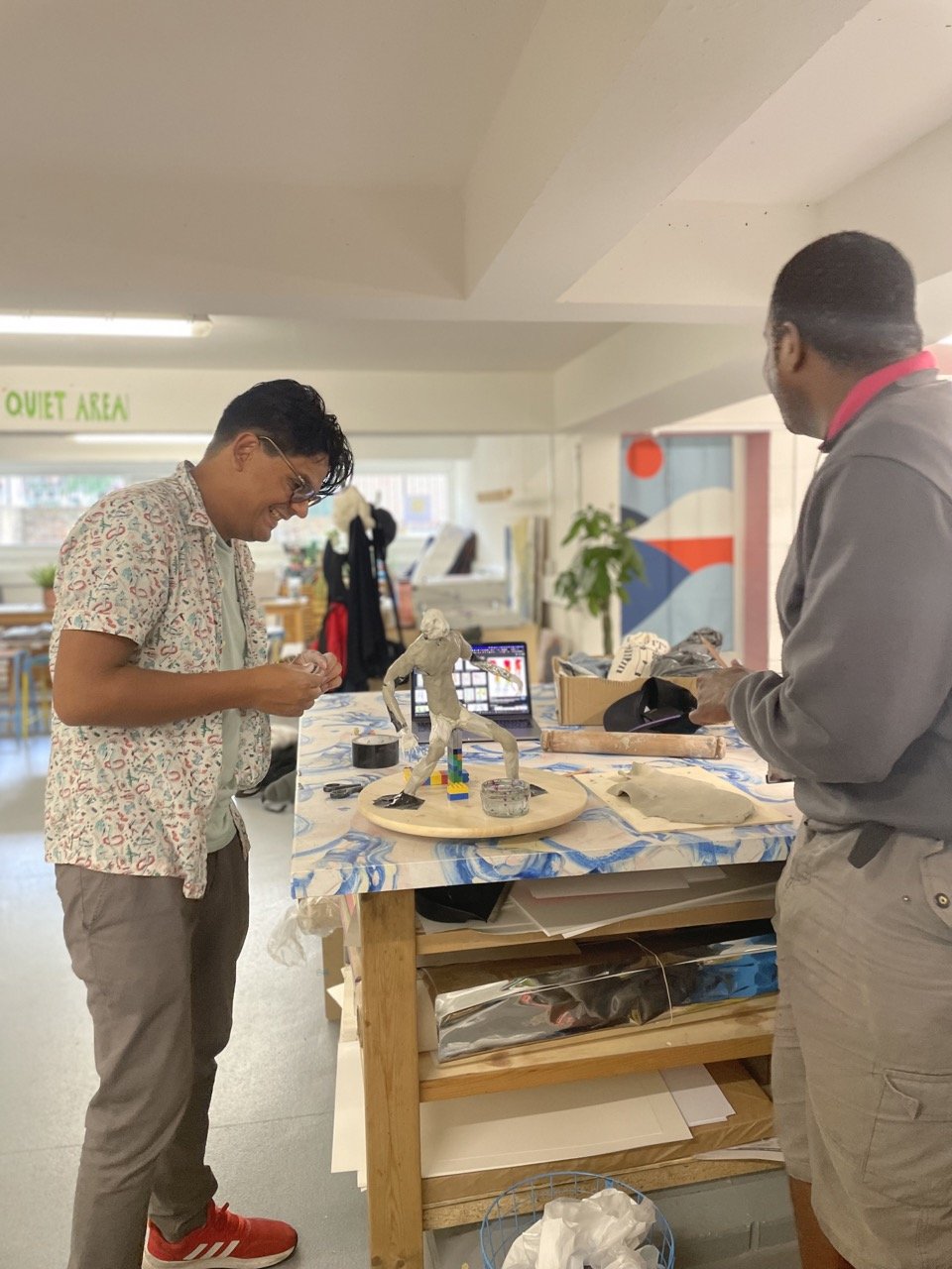 Image description: LC is laughing with Joel, they are creating a wire and clay sculpture in the Artbox studio
