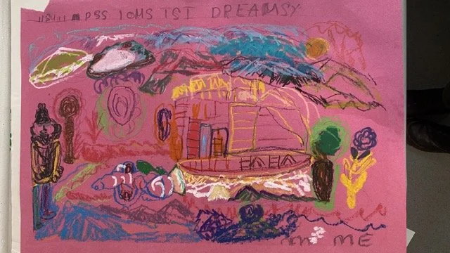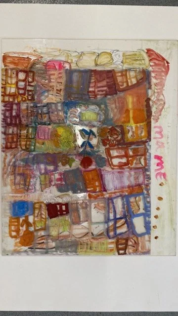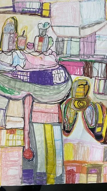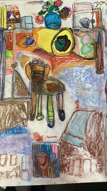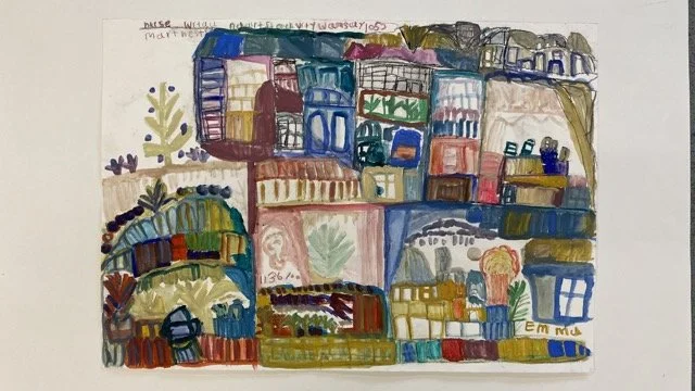 Emma creates vivid, expressive compositions inspired by women’s stories, art history, and the textures of daily life. Drawing from the Artbox library and group outings, she reimagines familiar forms - figures, interiors, bouquets - into swirling seas of colour and line, using watercolour, pastel, and pen. Her visual language is unmistakably her own. Often, her subjects are women: confident, powerful, surrounded by pattern, and holding court in imagined worlds.